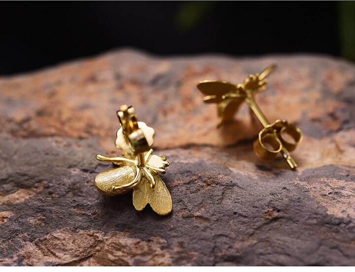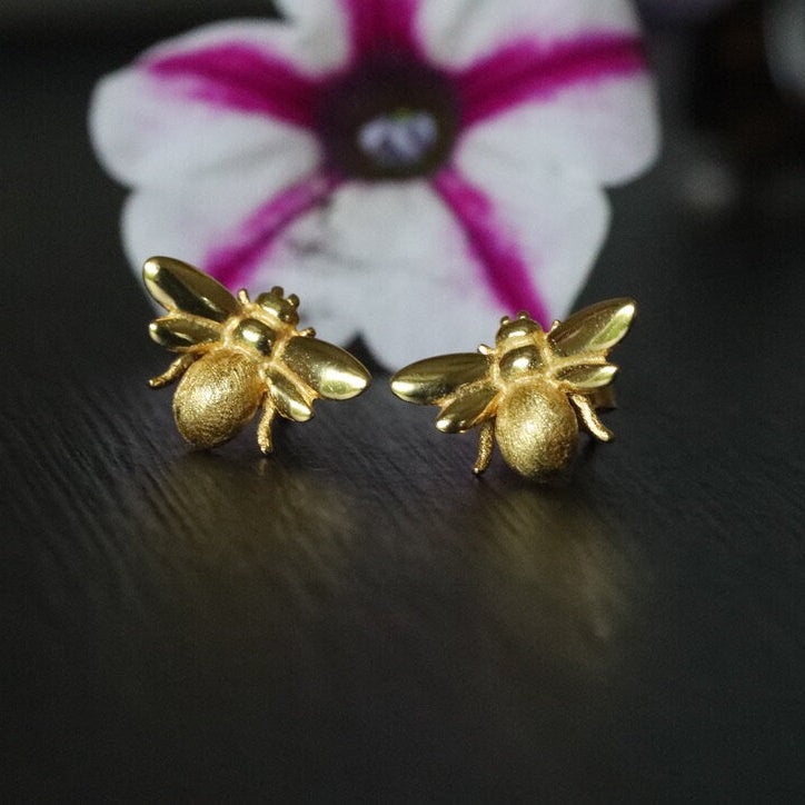 18k Gold Bee stud earrings, Sterling silver bee studs, honey been earrings, bumblebee earrings, silver bumble bee earrings, Insect Earrings.